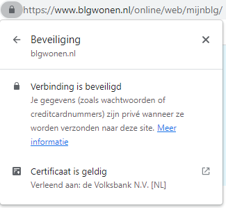 Het adres van BLG Wonen is https://www.blgwonen.nl/. De 's' staat voor 'secure': een beveiligde, versleutelde verbinding. Klopt de spelling en staat de slash na .nl/ in het adres? Dan weet je dat je echt op onze site bent. Staat er bijvoorbeeld www.blgwonen.nl.example.nl, dan zit je op example.nl en niet op blgwonen.nl.